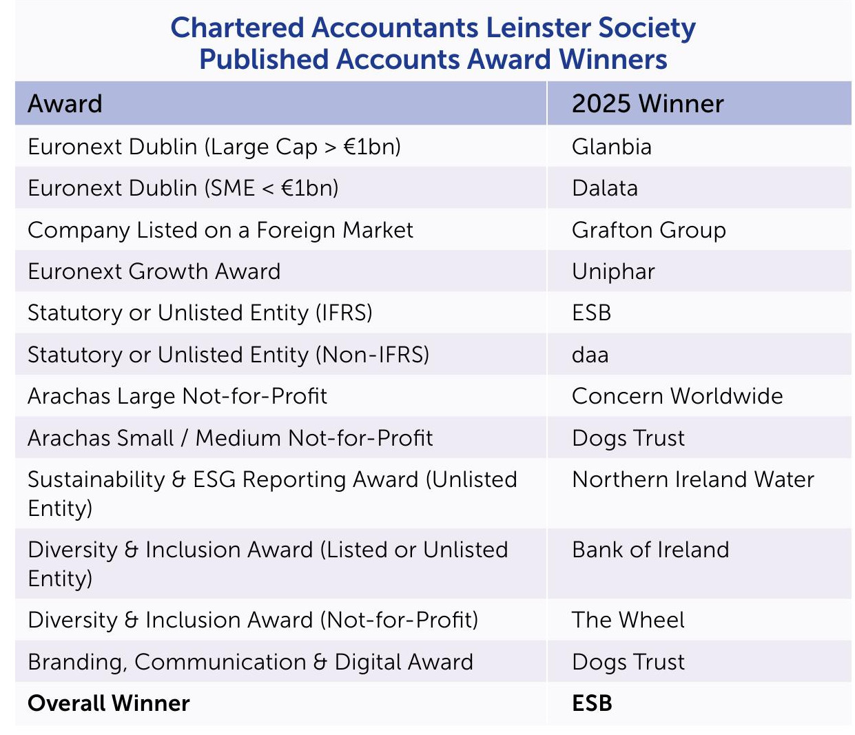 Chartered Accountants Ireland and the Leinster Society congratulate all this year’s winners.